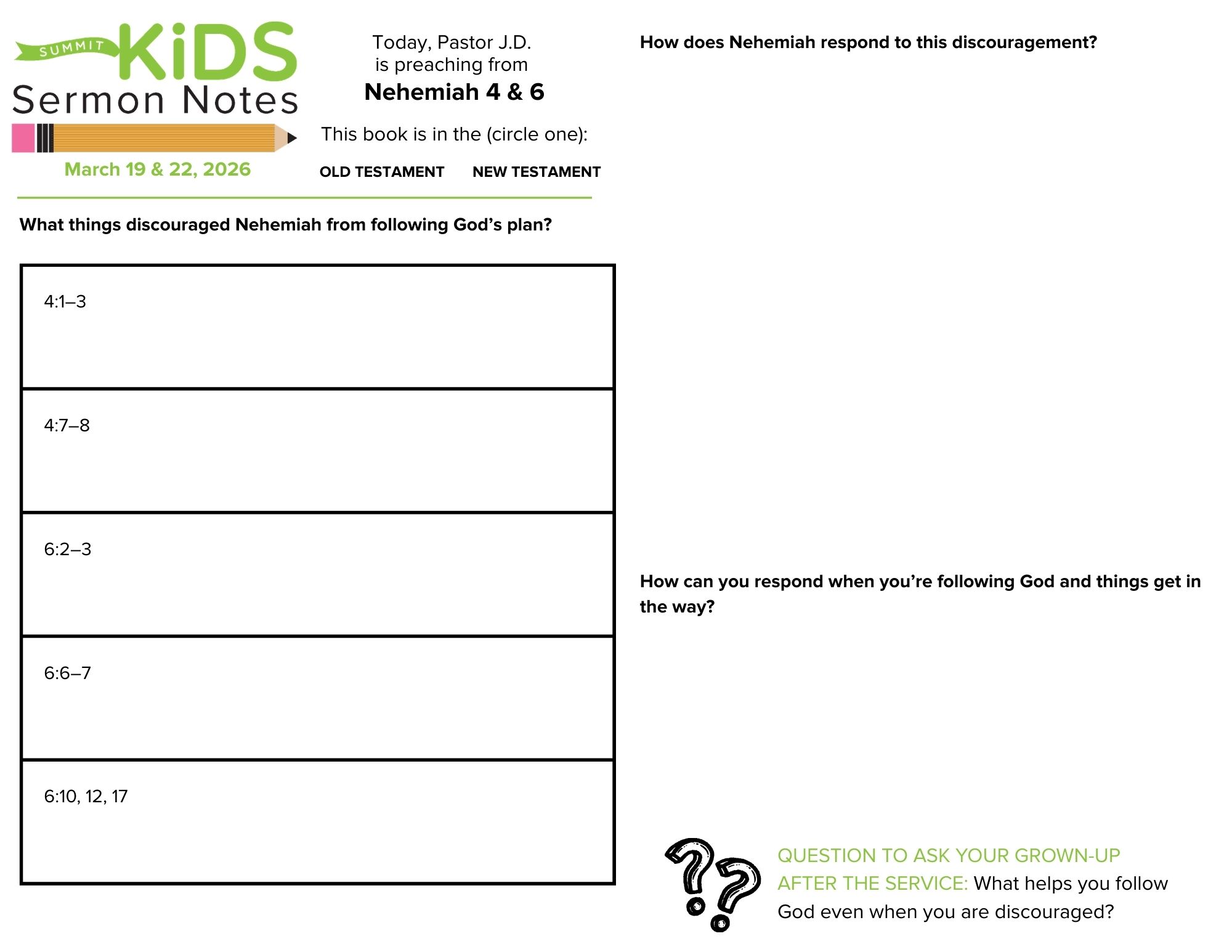 Toda obra de Dios en el mundo, ya sea grande o pequeña, se enfrenta a la oposición. Si queremos cumplir con el llamado de Dios, la perseverancia puede ser la cualidad más importante que debemos cultivar. En el mensaje de esta semana, basado en Nehemías 4 y 6, el pastor J.D. no solo nos muestra los diferentes tipos de oposición a los que se enfrentó Nehemías, sino también cómo respondió ante ellos. Una respuesta adecuada siempre comienza por recordar cómo Dios ha sido fiel en el pasado, y esto, en última instancia, alimenta nuestra confianza en que seguirá siendo fiel en el futuro.